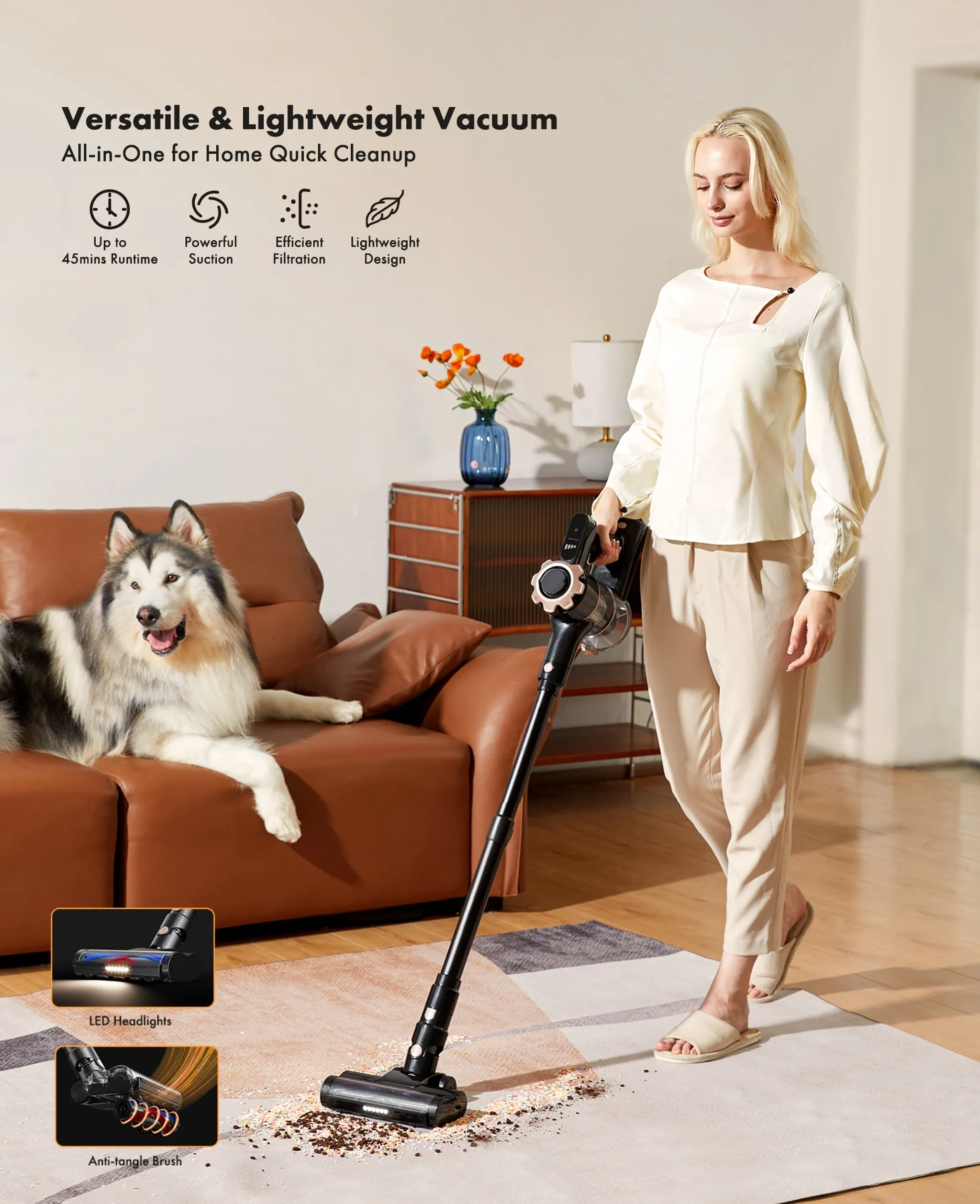 Powered by a high-speed brushless digital motor delivering strong and stable suction, this cordless vacuum easily removes dust, pet hair, and fine particles from floors, carpets, sofas, and car interiors while maintaining low noise operation.